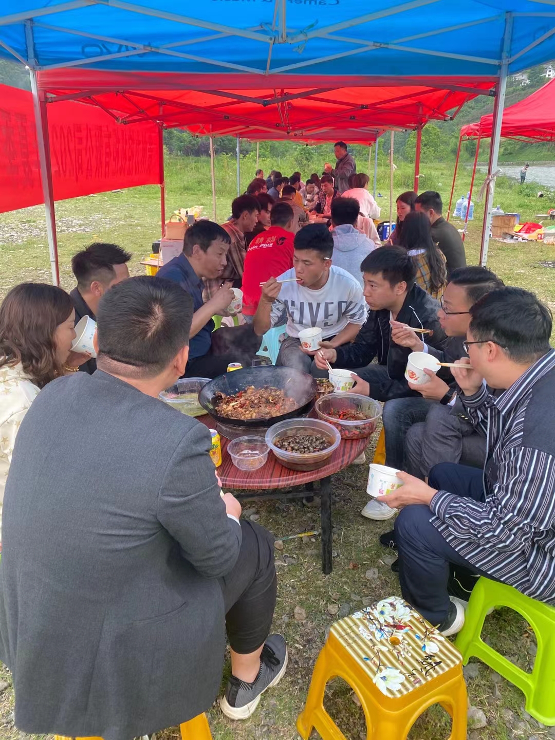 5月17日早晨,公司全体人员集合,收拾好装备大家就一起前往目的地,一路上风景格外的优美恬静。待全体人员到达目的地后,大家就开始分工,有的去撑伞、有的去下食材、有的去钓鱼......大家都开始动起了双手。所有的准备工作都做完后,开始了我们的第一场活动:野外烧烤;每个小组都吃得不亦乐乎,中途还有即兴表演唱歌,随着动听的歌声结束第一场活动也结束了;吃完后大家就开始清理战场,接着就是第二场小活动:互动小游戏;为了让大家回忆童真,我们准备了老鹰捉小鸡、埋地雷、教练说等等的一些小游戏。在游戏中不仅拉进了同事之间的距离,而且还让团队更有凝聚力。此外大家都玩得很尽兴,脸上都洋溢着开心笑容,且我们已经被欢笑声笼罩着。运动之后,大家都饿了,于是就开启了我们今天的最后一餐。